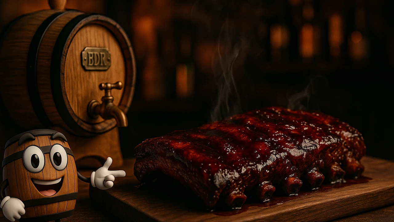 Costillas de res de cocción lenta glaseadas repetidamente con salsa BBQ mexicana que reposó 6 semanas en barril ex-bourbon. El resultado es una carne que se deshace, con costra caramelizada y notas profundas de vainilla, mezcal y chipotle. Estilo sureño americano con alma mexicana.