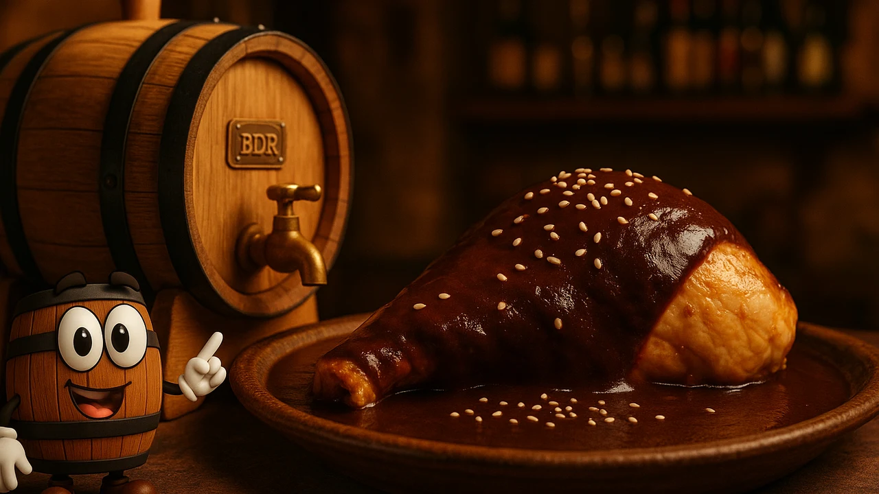 El mole poblano es el platillo ceremonial más complejo de México con 20+ ingredientes. Esta versión eleva el clásico usando chocolate mexicano de metate previamente añejado 3 semanas en barrica de roble. El chocolate gana notas de vainilla y tostado que amplifican la complejidad del mole.