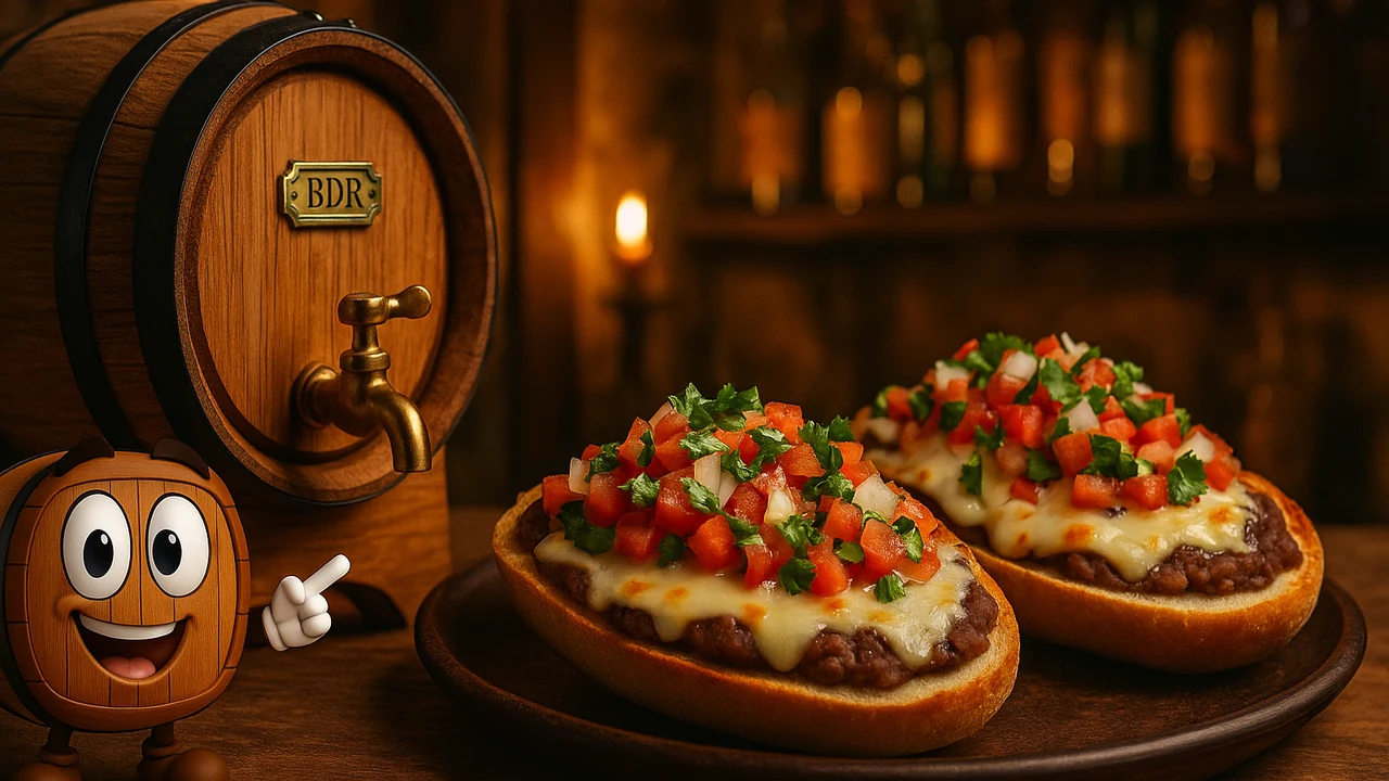 Los molletes son el desayuno práctico por excelencia: bolillo con frijoles, queso gratinado y pico de gallo. Esta versión añade un toque de salsa roja reposada en barrica que transforma la simpleza en experiencia gourmet.