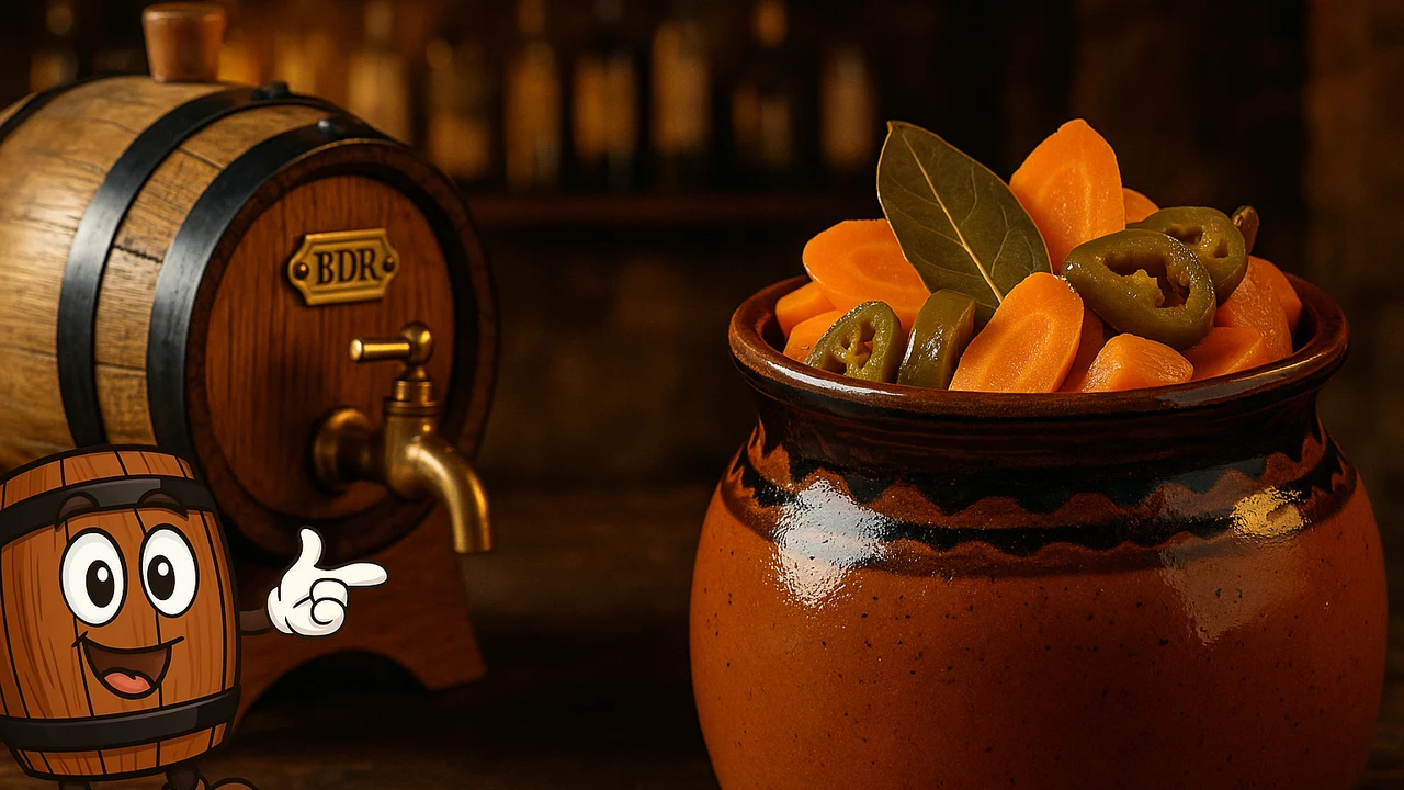 Barril de 5 a 10 litros de roble previamente curado con vinagre. Un barril nuevo sin curar daría demasiada madera verde a las zanahorias.